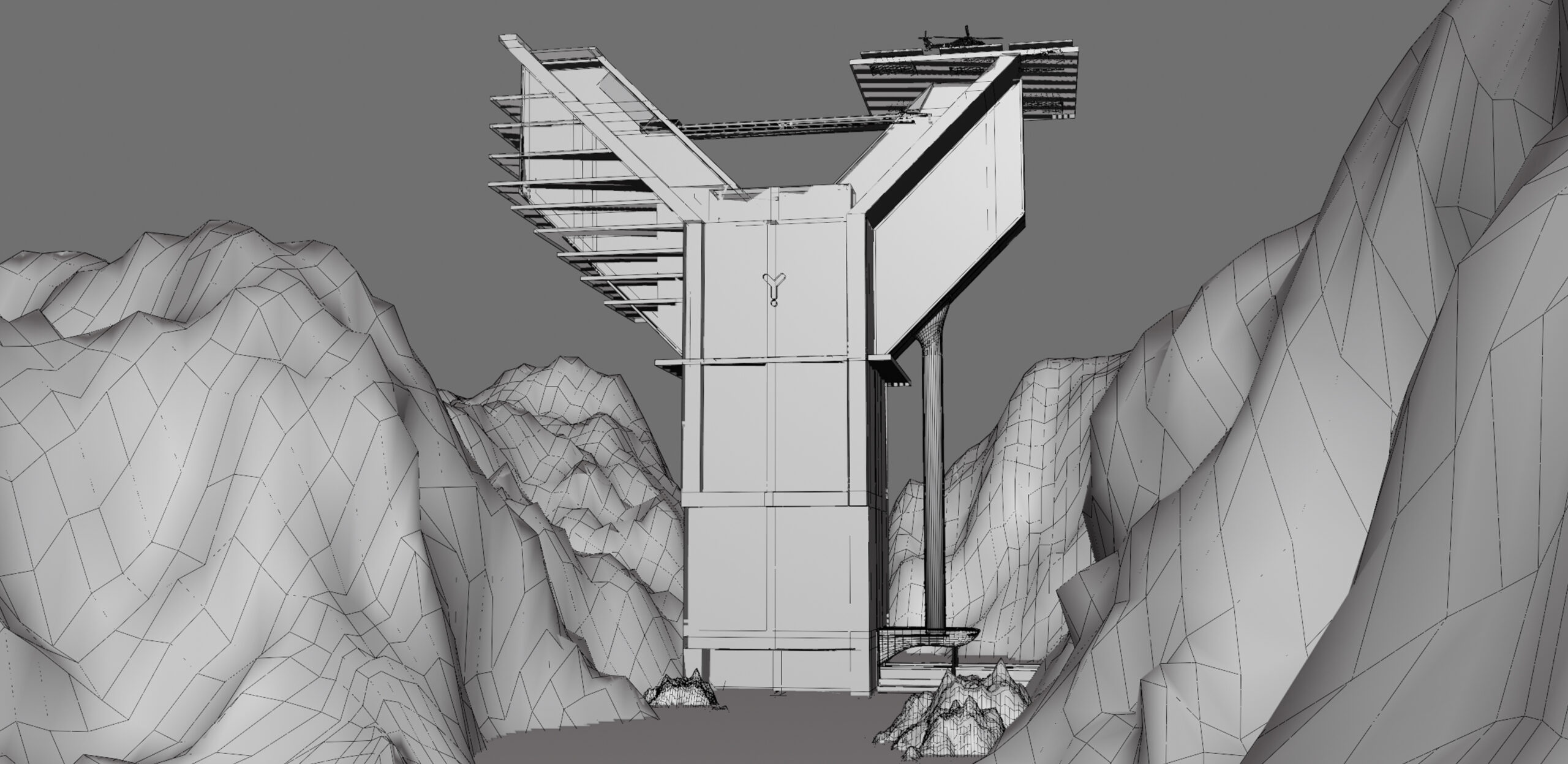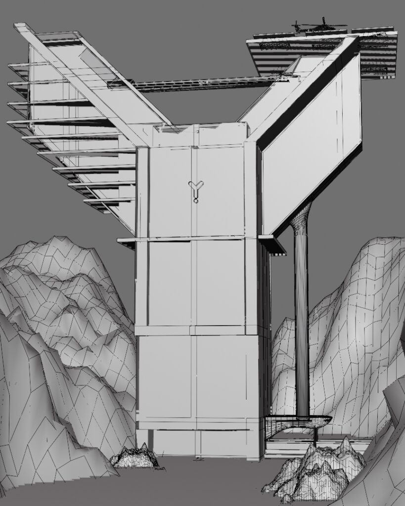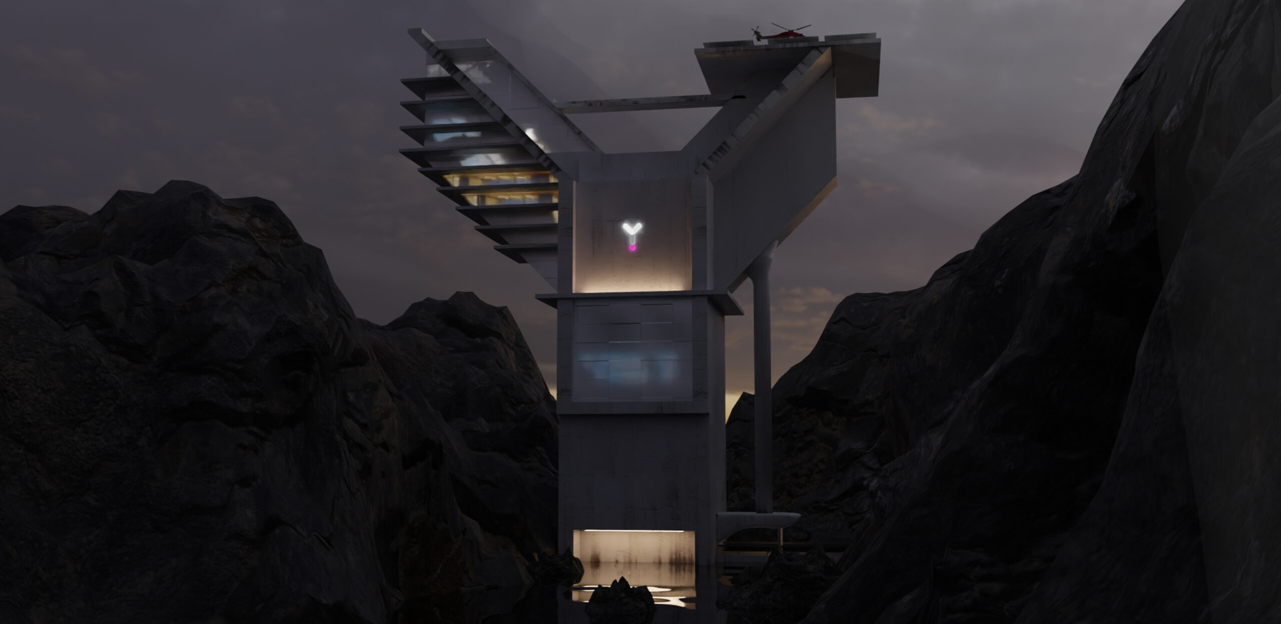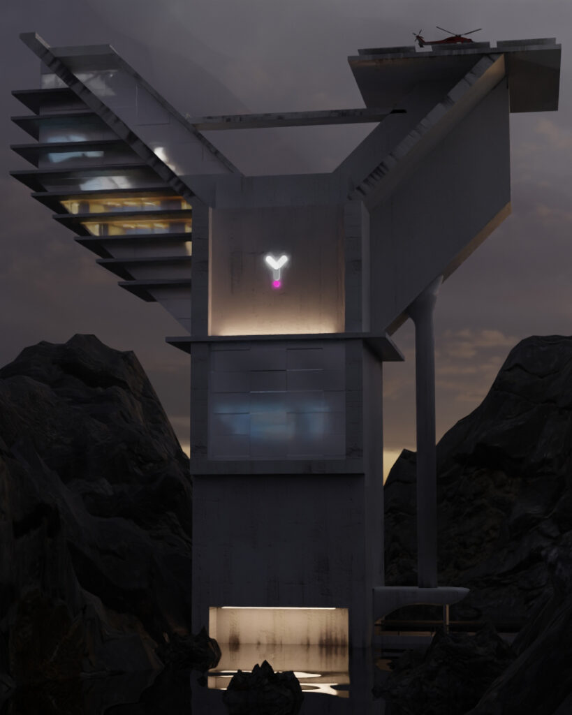 A cinematic cliffside observatory created in Blender, designed to capture a futuristic and isolated atmosphere at dusk. The structure was modeled with a focus on clean hard-surface geometry and modular design, while the surrounding rocks were sculpted to naturally frame the composition and enhance depth. Interior lighting was carefully balanced against the dark environment to create contrast and mood. The wireframe comparison highlights the underlying topology and structural detailing behind the final render.
